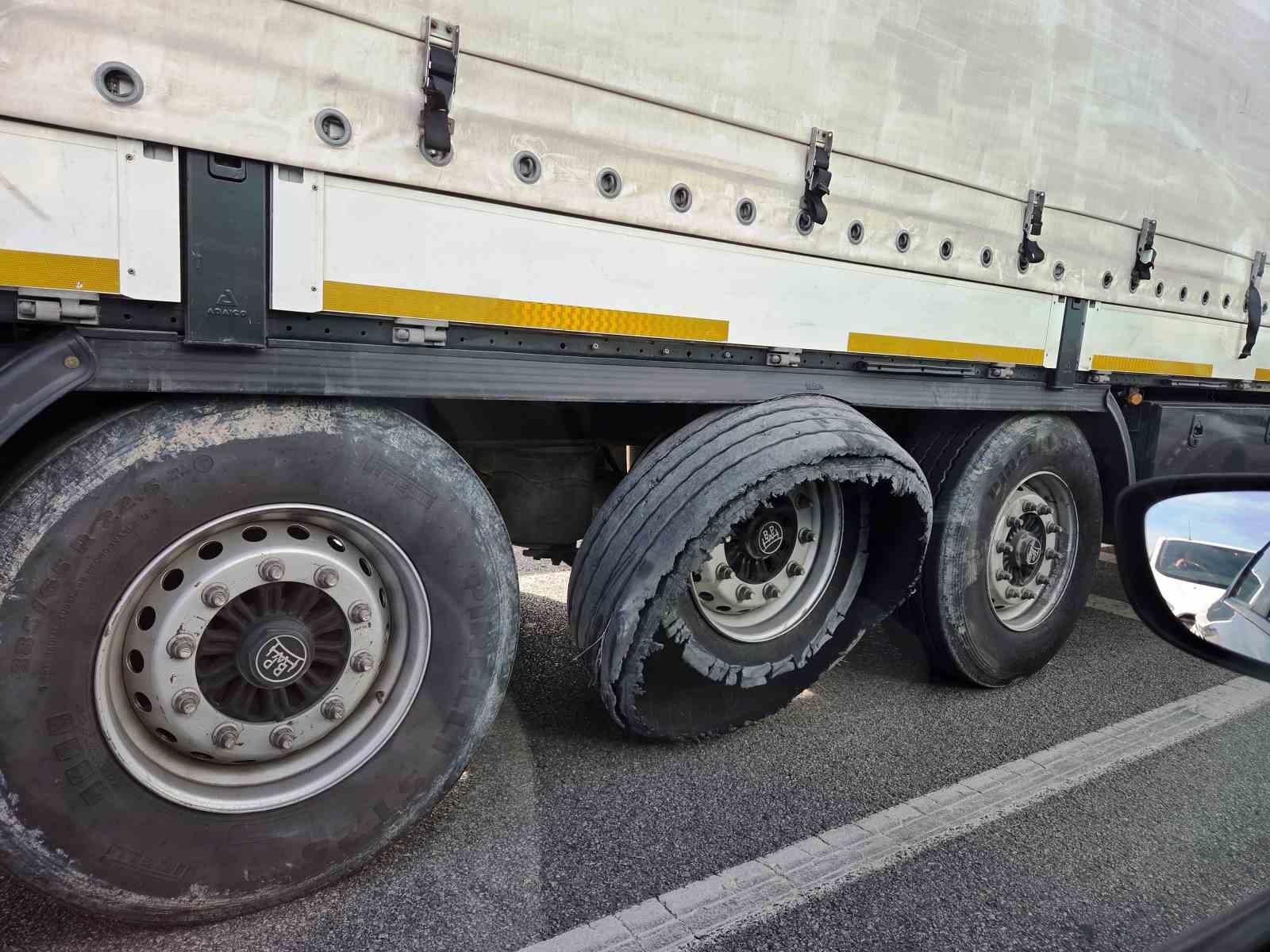 Lastiği parçalanan tırın tehlikeli yolculuğu