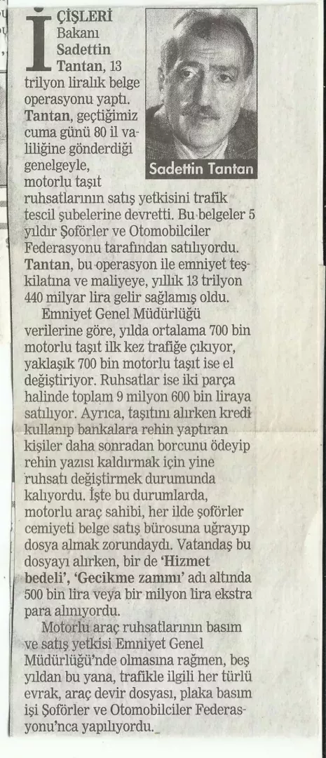 Büyük bir yurtsever ve son derece başarılı bir devlet adamı olan Sayın TANTAN bu haksız kazanca ve sürücülerin sömürülmesine seyirci kalmayarak olaya müdahale etti ve 2 Ağustos 1999’da yayınladığı genelgeyle 5 yıldır sürdürülen bu uygulamaya son verdi.