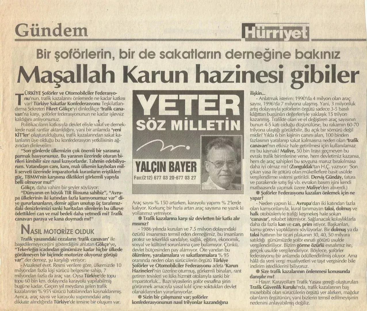 Ben o zaman Konfederasyonun Teşkilatlanma Sekreteriydim. Yazdığım yazılarda sadece 3 yıl içinde bu rantın 15 trilyon liraya ulaştığını, sürücülerin mağdur olduğunu, önceden olduğu gibi daha ucuza yapılacak bu hizmetin devletin ilgili birimlerince yapılmasını, devletin kazanmasını savunuyordum. Yazı ve yayınlarımızı okuyarak konuya ilgi duyan Yalçın BAYER benimle bir röportaj yaptı ve sorunu ekte gördüğünüz gibi, 21 Ocak 1999’da Hürriyet Gazetesi’ndeki “Yeter Söz Milletindir” köşesinde “Maşallah Karun hazinesi gibiler” başlığıyla dile getirdi.