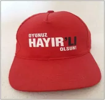 Ekte görselde gördüğünüz şapka ise ; 16 Nisan 2017 tarihinde yapılan Anayasa Referandumu öncesi düzenlenen ANAYASA’YA HAYIR kampanyasının şapkasıydı. AKP iktidarı 1982 Anayasa’sını “Darbe Anayasası” olarak adlandırıyor, değiştirmek istiyordu. Aslında asıl amacın kuvvetler ayrılığını kaldırmak, meclisi etkisizleştirerek denetim gücünü zayıflatmak ve yönetim erkini tek elde toplamak olduğu görülüyordu. 21 maddeden oluşan değişiklik önerisi muhalefetin direnciyle 18 maddeye indirildi. Bu şekliyle halkın oyuna sunulan yeni anayasa YSK’nun aldığı kararla 2.5 milyon mühürsüz oyun kullanılması sonucu az bir farkla kabul edildi. Kullanılan oyların yüzde 51.43’ü olan 25 milyon 133 bin 351 oyla EVET, yüzde 48.57’si olan 23 milyon 758 bin HAYIR oyla iktidar amacına ulaşmıştı.